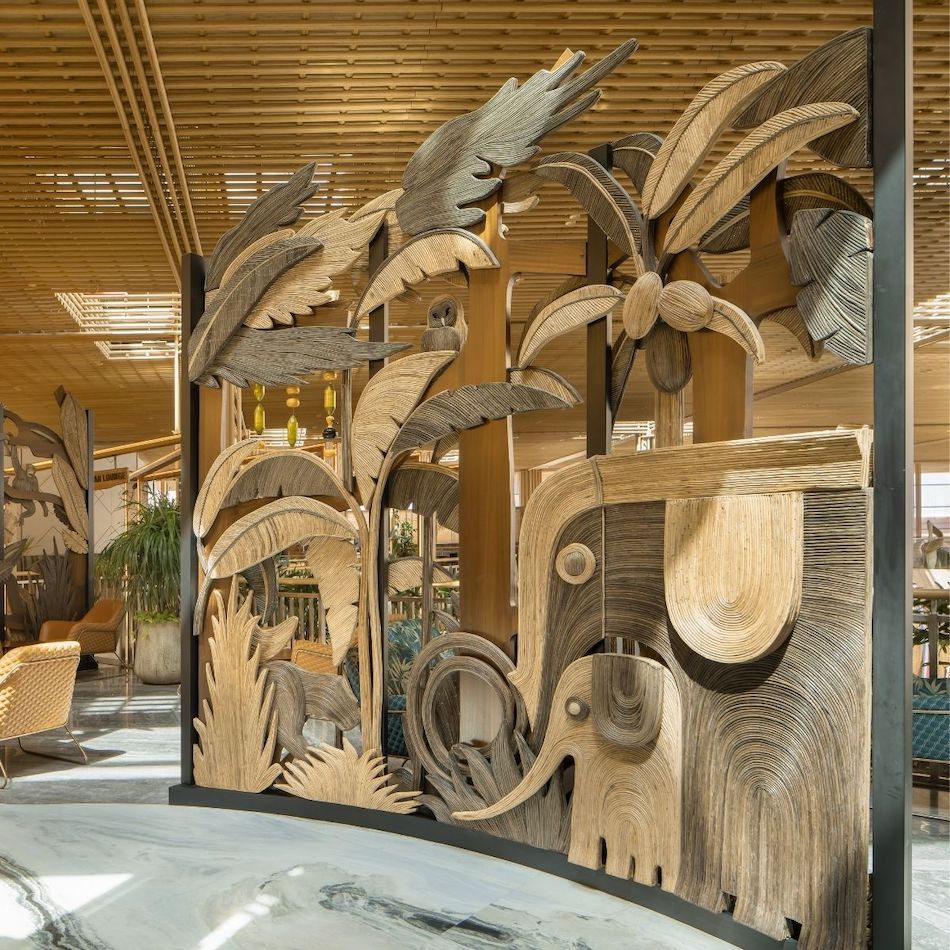 Made from banana fibre paper, faux concrete, and Lantana (an invasive weed), the works honour Karnataka’s biodiversity and traditional craftsmanship. Gaia Pillars glow softly at Kodagu Café; Bell lights inspired by kasuti prints and temple chimes line the baggage area. In collaboration with Adivasi artisans and TREC, life-size elephants and marine forms sculpted from Lantana speak of forest and coastal ecologies.