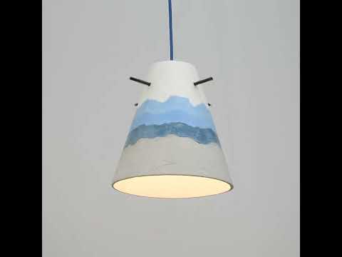 Inspired by the transitioning lights of daylight, this hanging Aglow lamp, handcrafted from pigmented feather cement with a MS black peg, and a blue fabric encased wire suspension, is best suited for residences and hospitality spaces.