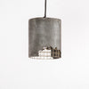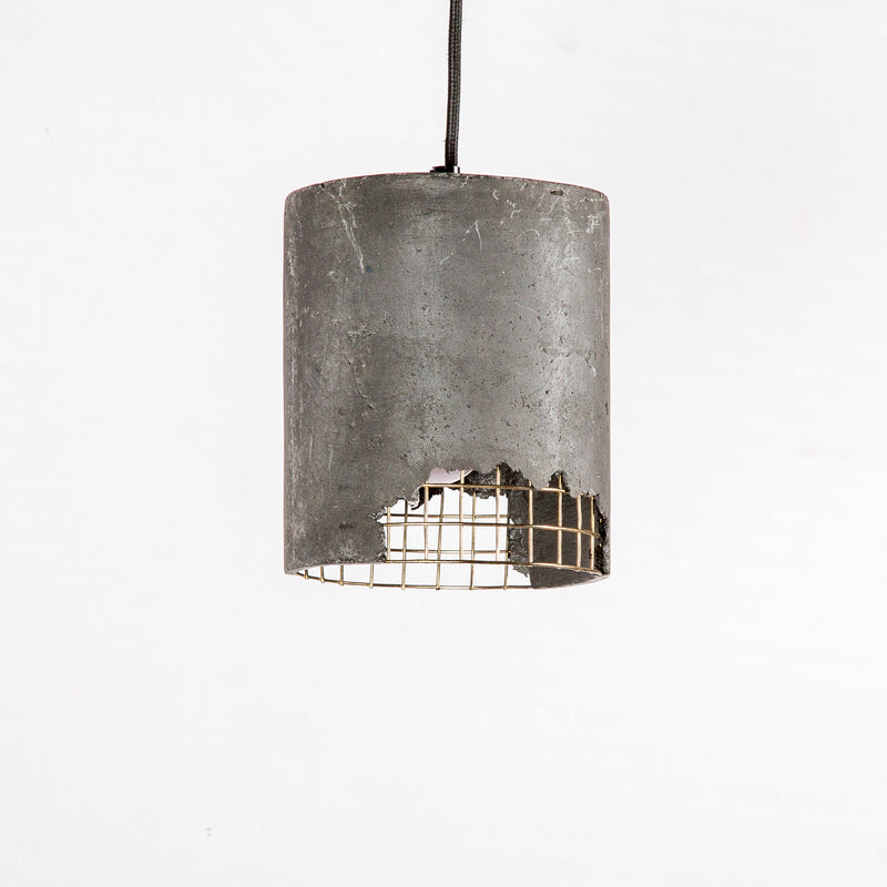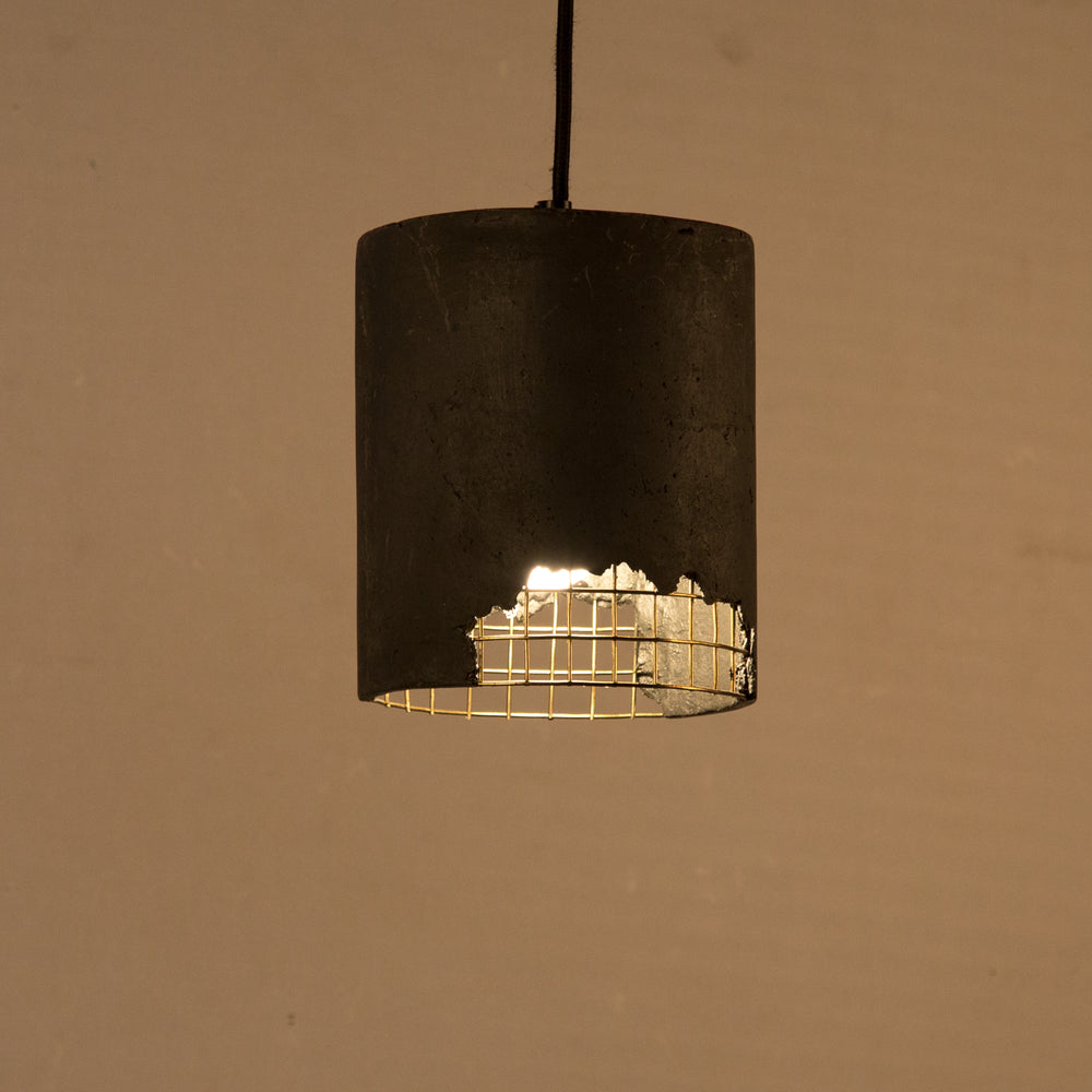 Weathered imperfections captured in a Black Canister Fusion hanging lamp, handcrafted from pigmented feather cement with a brass plated mesh, to lend classic elegance to living and hospitality spaces.