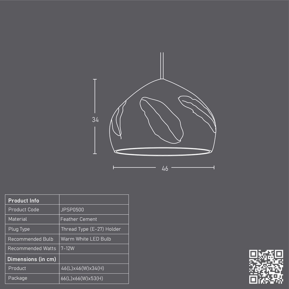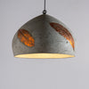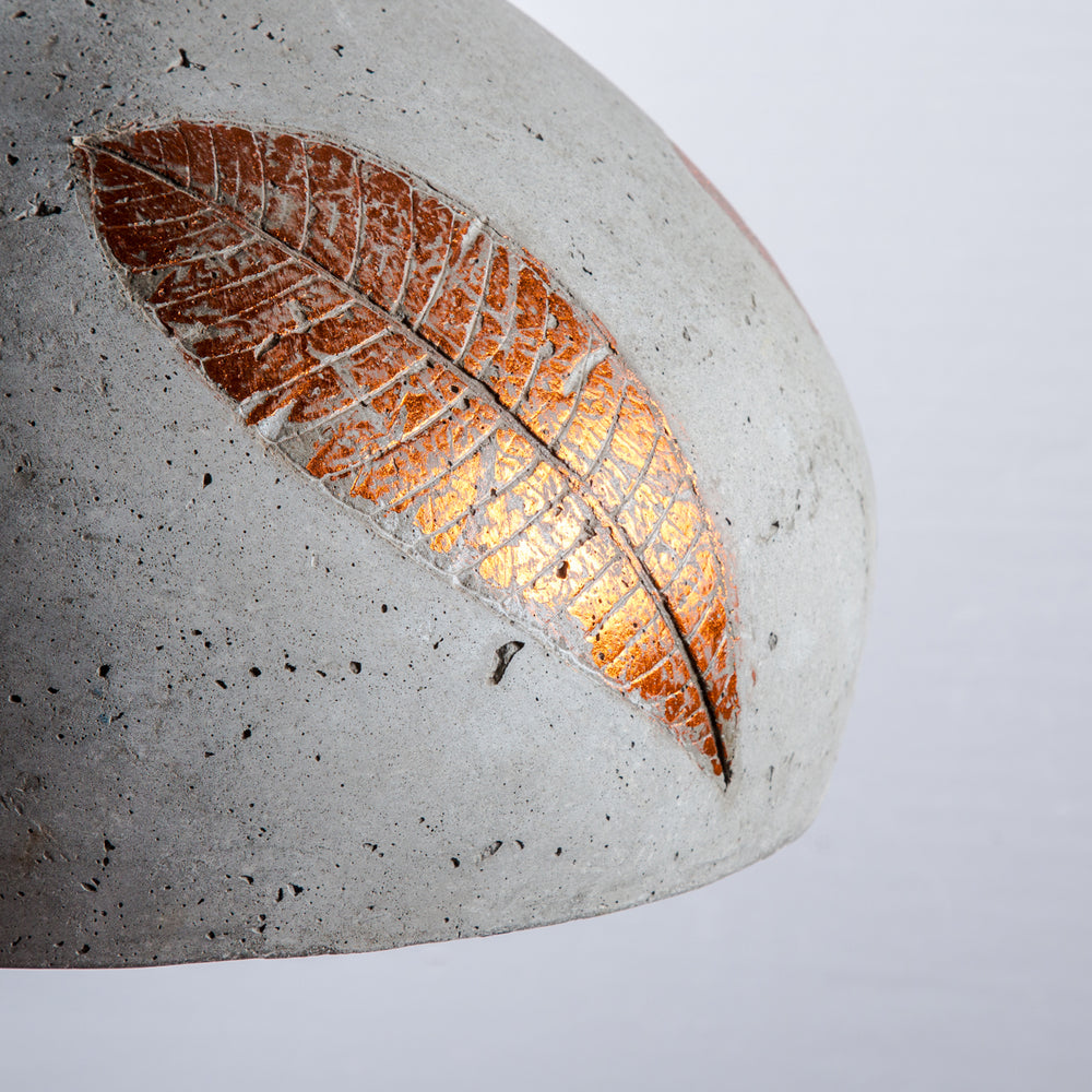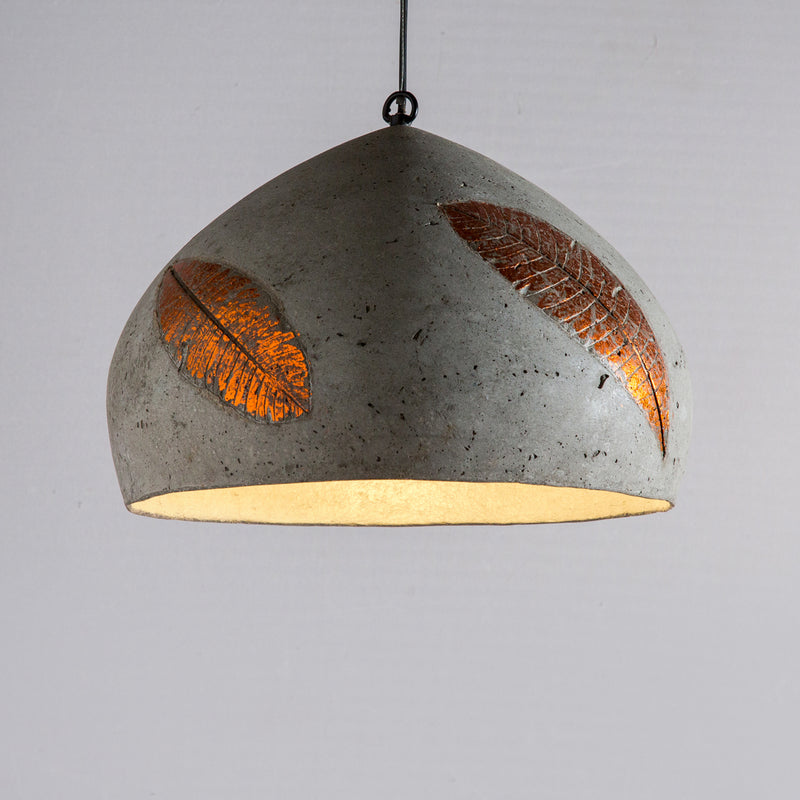Lending form to weathered imperfections in a Folio Domical hanging lamp, handcrafted from feather cement and adorned with a silver/Copper finish leaf embossing, to artistically light up a living or hospitality space.