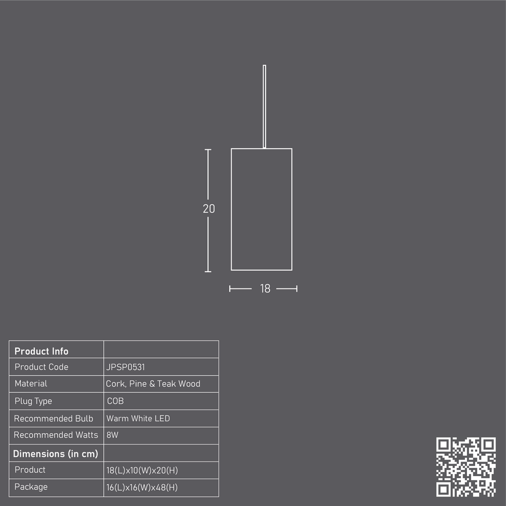 A pert rendition of the Dowel in a hanging LED lamp, handcrafted from light cork with a pine wood-teak finish fitting, to add a new-age quirk to work and living spaces.