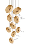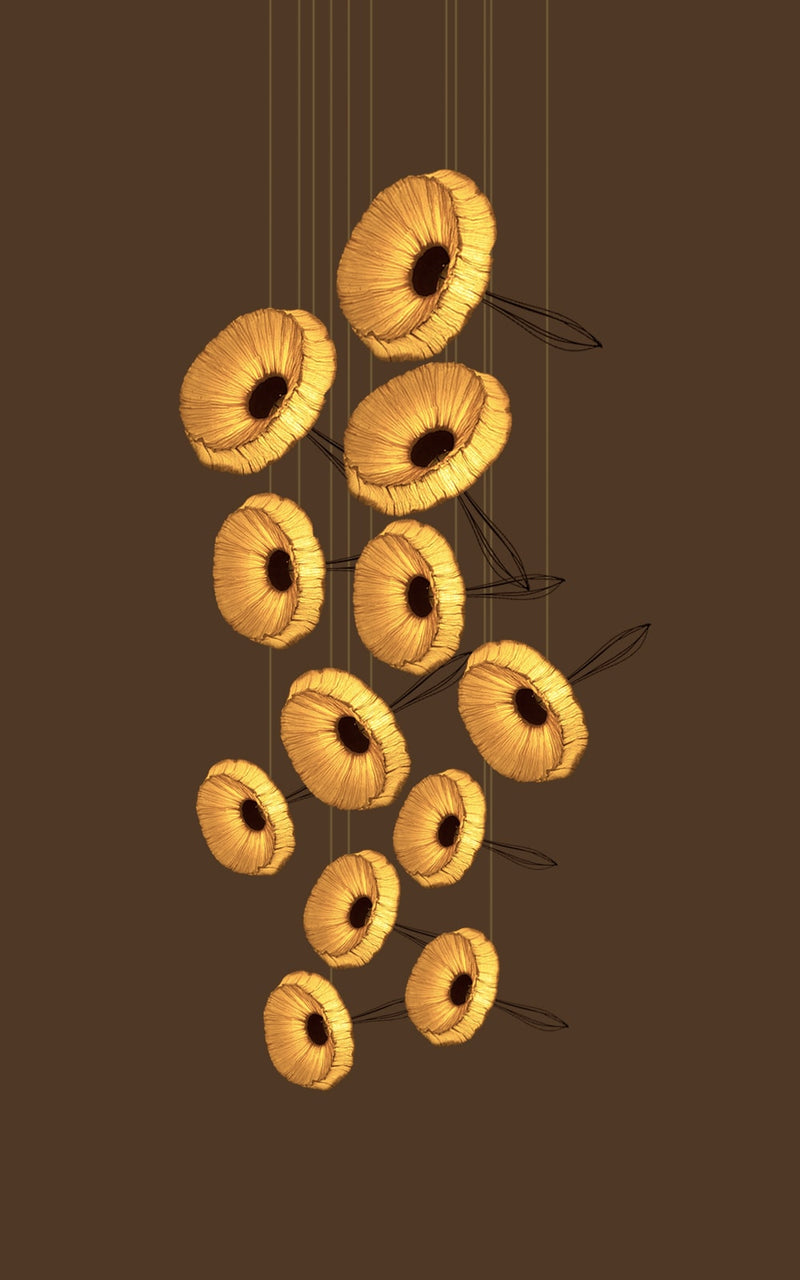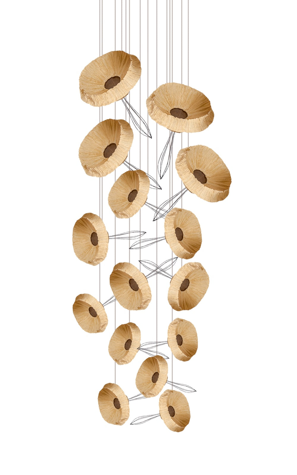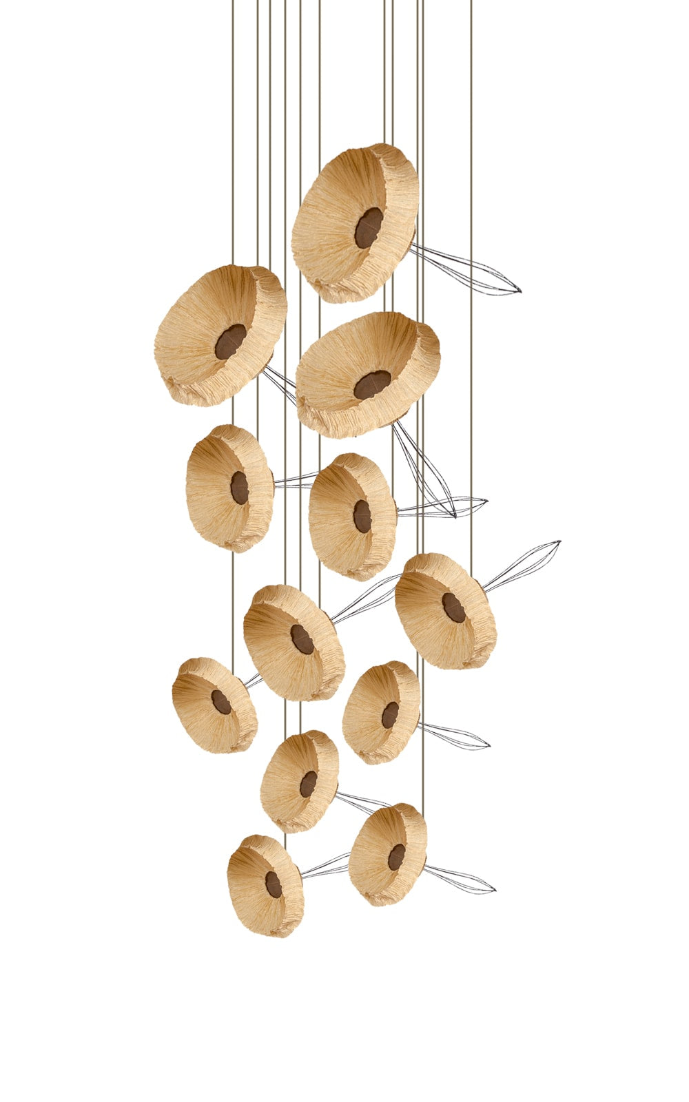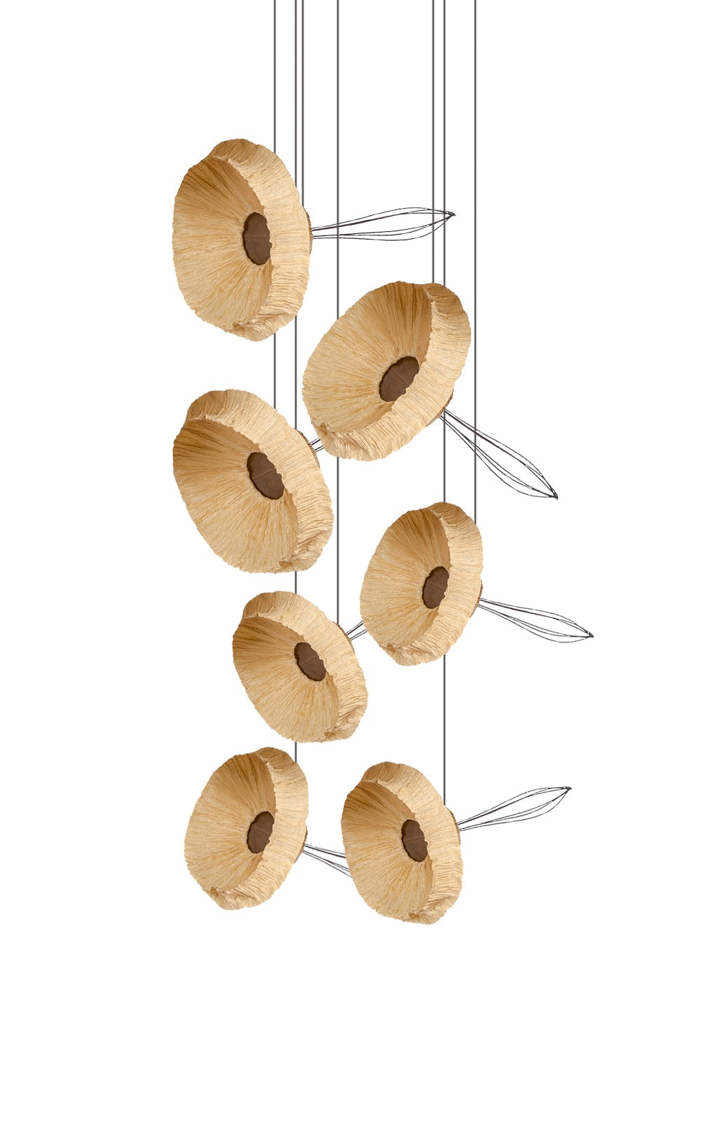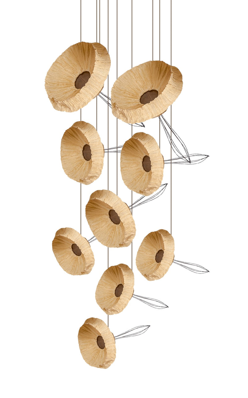 A fine rendition of perineal dandelions, this drop-down penta-cluster lamp, beautifully blends hand moulded crushed banana paper with a metal frame in antique copper finish. Suspended from a wooden panel, the striking lamp could grace a residence or a hospitality space.