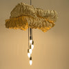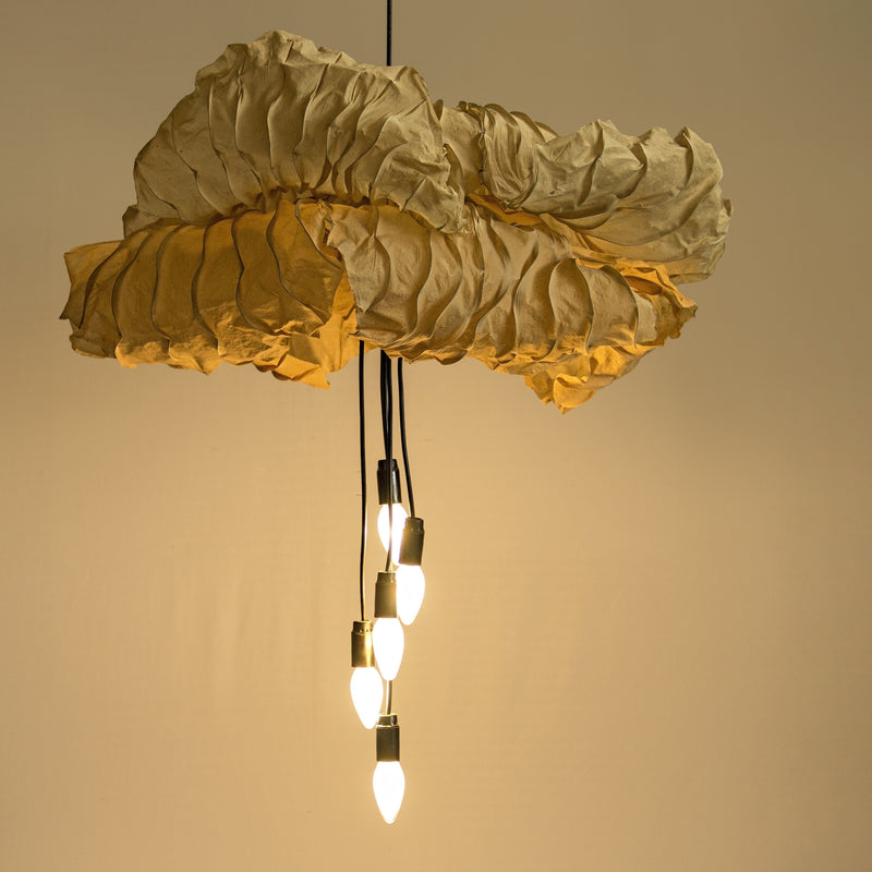 The beauty of tropical passion flowers, captured in a twin flower chandelier, with vine-like drop lights. Beautifully blending all the shades of hand sculpted banana paper, with a teak wood suspension. An artistic addition to ceilings in residences and corporate spaces.