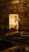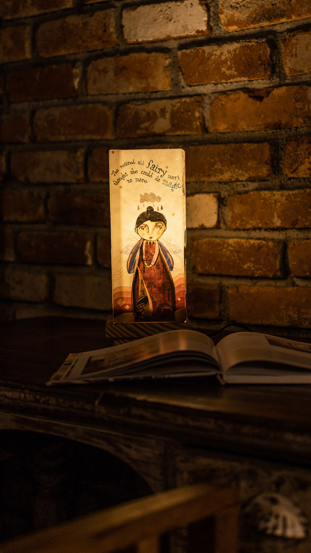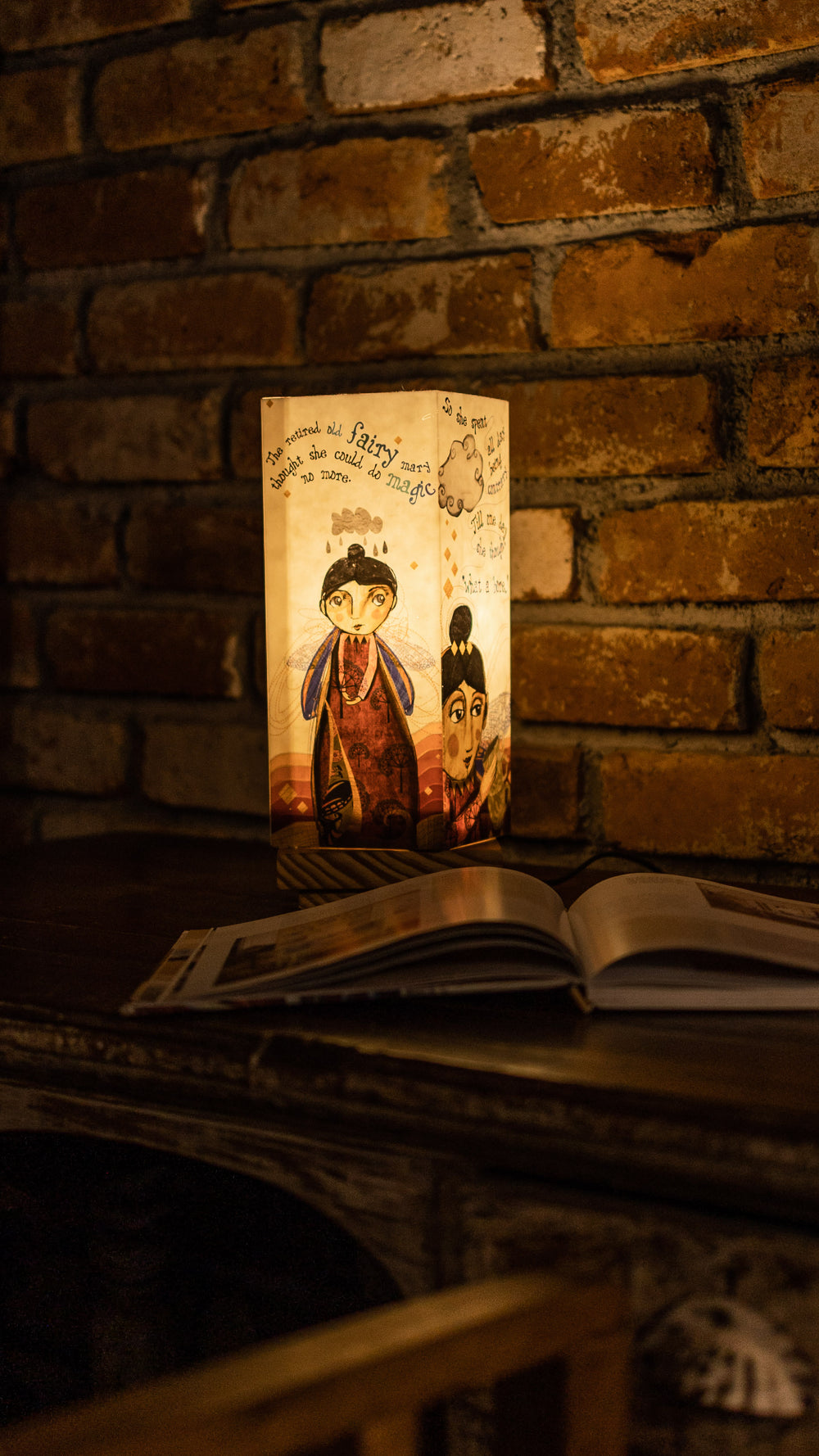 Fairy tales rendered onto a printed PVC sheet, for a table lamp handcrafted from lokta fibre paper with a pine wood base, ideal for little ones’ bedsides.