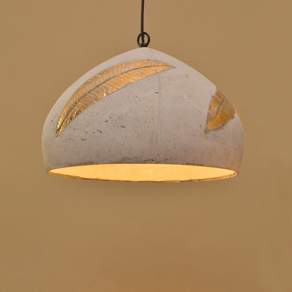 Well-worn imperfections moulded artistically into a hanging Folio Domical lamp, handcrafted from feather cement and embossed with a gold finish leaf, to lend muted luminosity to contemporary homes and hospitality settings.