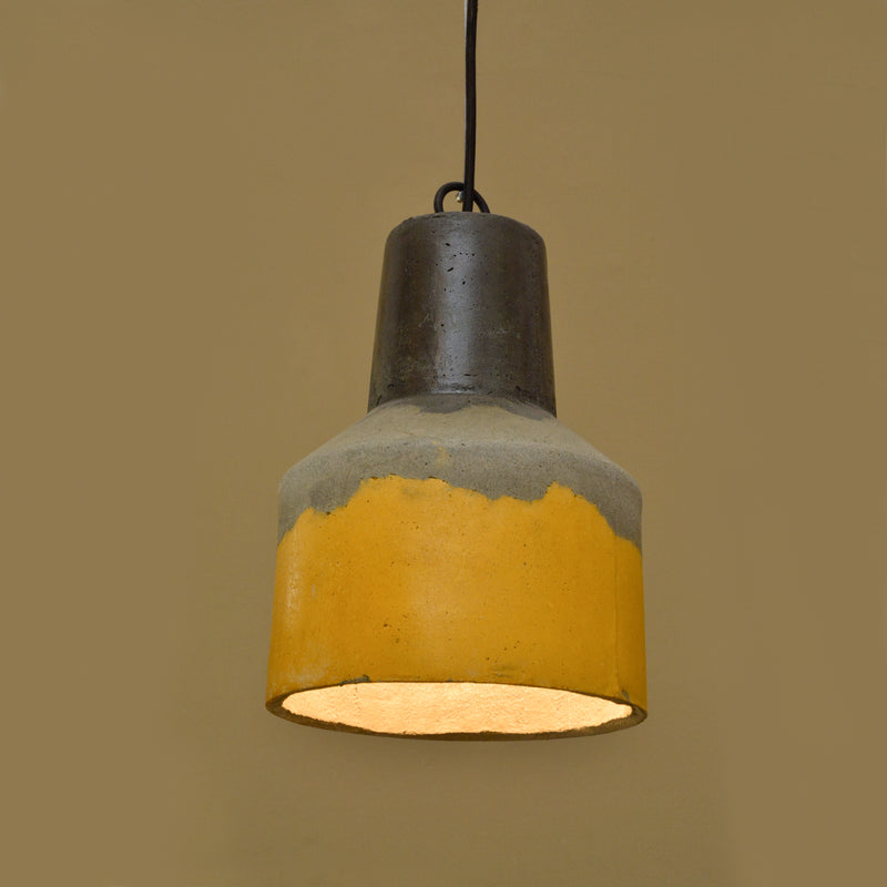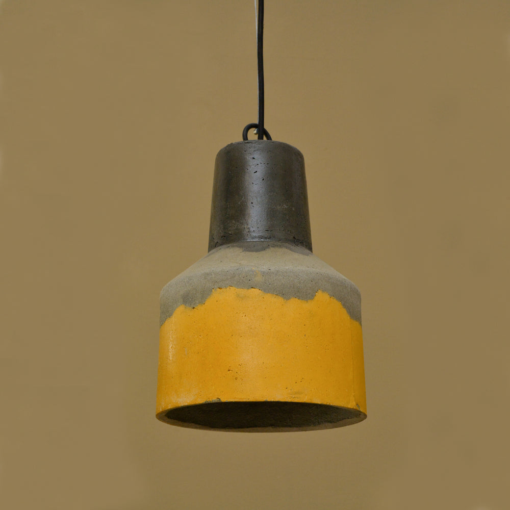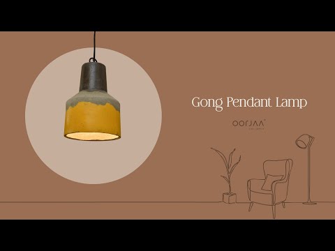 The Golden Hour entrapped in a hanging mustard gong lamp, handcrafted from pigmented feather cement and suspended from a black fabric encased wire, to wistfully light up any living or hospitality space.