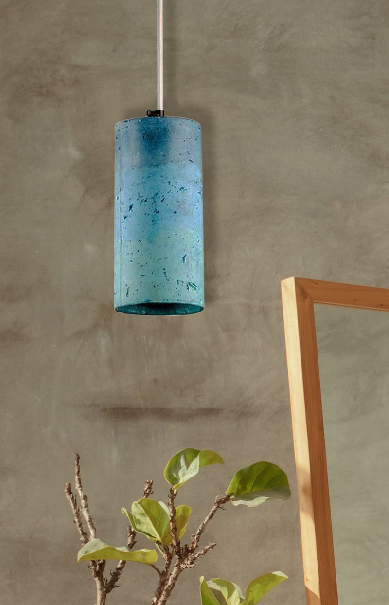 The different gradations of daylight find form in a hanging Meryl lamp, handcrafted from pigmented feather cement, to spread a soft glow in living and hospitality spaces.