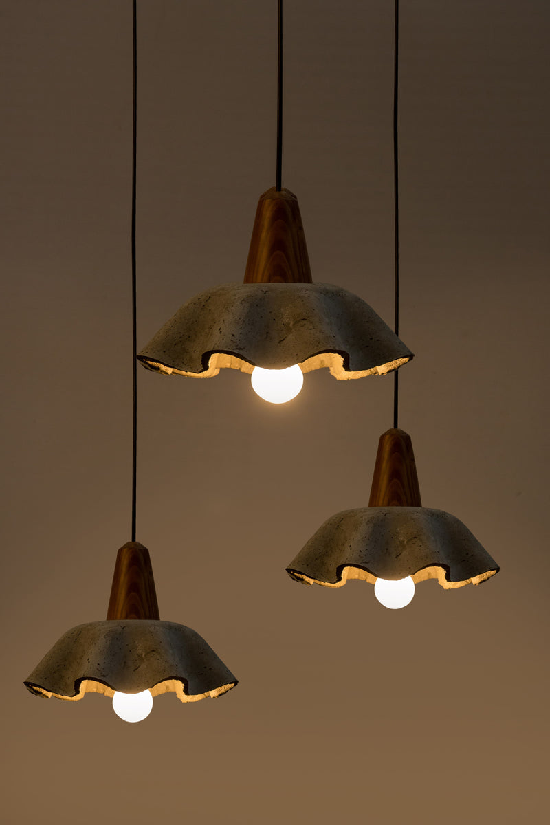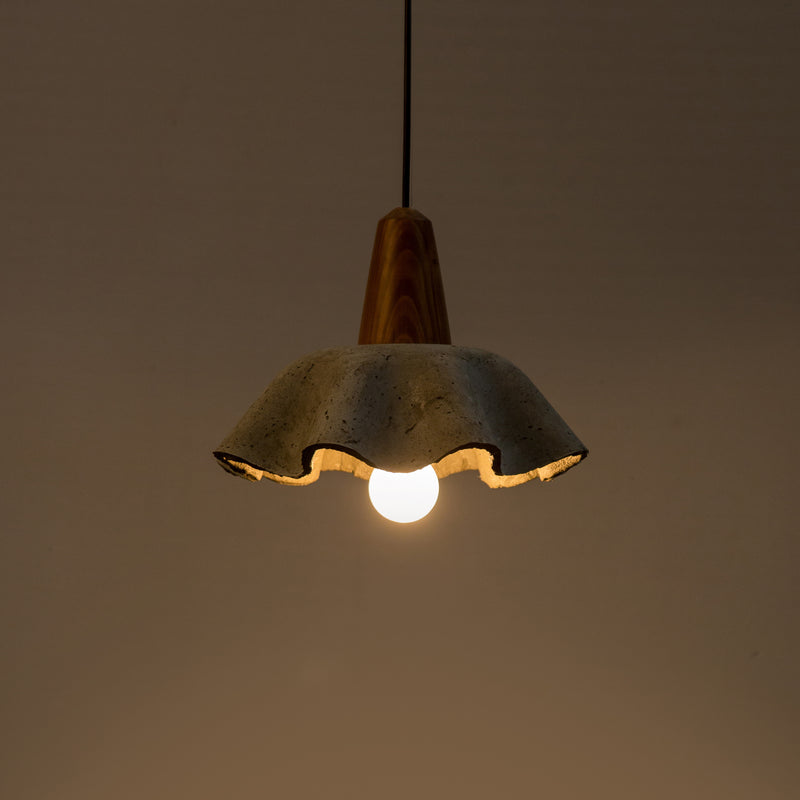 The promise of weathered imperfections crafted in to a small Woodlot Twill hanging lamp, handcrafted from feather cement with a teak finish pine wood top, to add an enchanting allure to any living or hospitality setting.